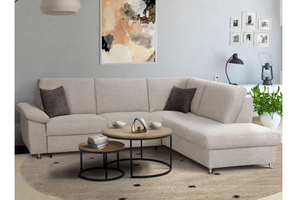 Moderná rohová sedačka pasuje skvele do každej modernej i klasicky zariadenej obývačky. Sedačka má výplň z kvalitnej studenej peny a ponúka tak komfortne mäkké sedenie. Operadlo v pevnej vankúšovej optike poskytuje príjemnú oporu počas každodenného sedenia. Očalúnená žinilkovou látkou vo farbe šedo-béžová a doplnená vankúšikmi. Elegantný design sedačky podčiarkujú stabilné kovové nohy. Táto varianta sedačky je vybavená funkciou polohovej podrúčky a funkciou rozkladu na príležitostné lôžko.