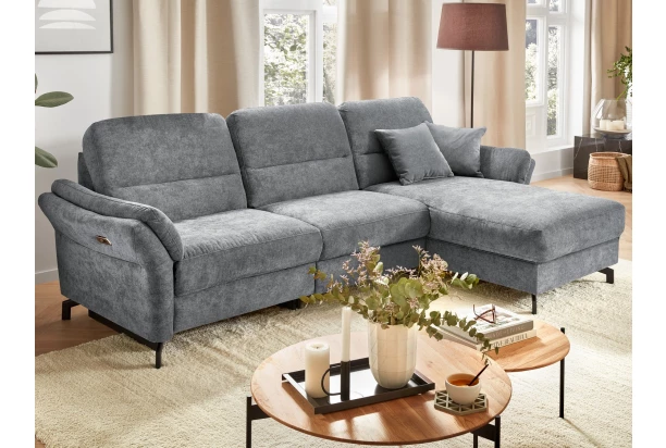 Rohová sedačka Leraja má kvalitne vypolstrované sedenie so studenou penou a svojimi rozmermi sa hodí aj do malého priestoru obývačky. Rohová sedacia súprava tvorí s otomanom pravý roh a je očalúnená jemne štruktúrovanou látkou vo farbe holubia šedá. Zaoblené tvary, vankúšová optika a čierne kovové nohy pôsobia ako celok veľmi elegantne. Táto varianta sedačky je navyše vybavená elektrickým polohovaním ľavého sedáku, ktorý sa ľahko premení na pohodlné relaxačné lehátko.
