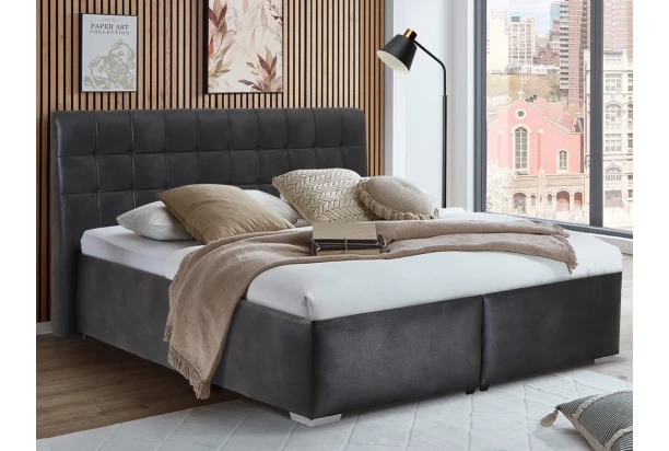 Elegantná dvojlôžková posteľ s veľkosťou 180×200 cm je očalúnená zaujímavou látkou vo vintage optike kože v odtieni antracitová temne šedá. Zadné prešívané čelo dotvára lesklo čierne gombíky a posteľ tak pôsobí štýlovo. Lôžko je vybavené lamelovými roštmi s nastaviteľnou tuhosťou. V dolnej časti postele nájdete prakticky objemné úložné priestory, ktoré sú ľahko prístupné z bočných strán po vyklopení roštov. Táto varianta postele obsahuje navyše aj pohodlne vysoké penové matrace so zvýšenou nosnosťou a anatomickými zónami.