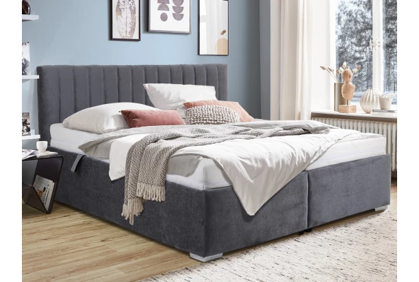 Trendová manželská posteľ o veľkosti lôžka 180×200 cm je očalúnená príjemne mäkkou látkou v odtieni dymovo šedá a doplnená zvislým prešívaním chrbtového čela. Posteľ obsahuje lamelové rošty aj objemné úložné priestory, ktoré sú ľahko prístupné z bočných strán po vyklopení roštu. Túto posteľ môžete navyše doplniť matracmi o veľkosti 90×200 cm.