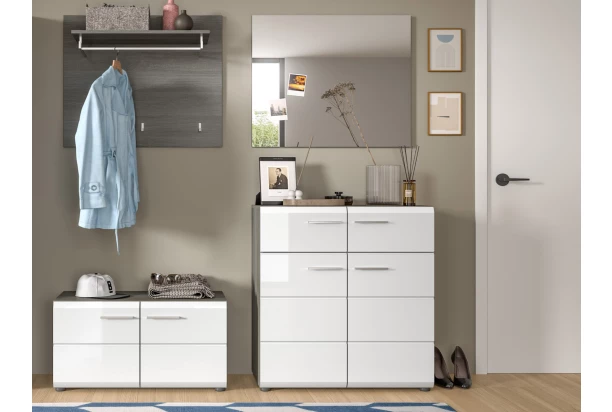 Predsieňová zostava z programu Salsa (4-dielna) – moderný, elegantný a zároveň praktický nábytok v kombinácii sivý dymový dub s lesklo bielymi plochami. Lesklé čelné plochy dopĺňajú horizontálne frézované línie a zaoblené hrany, ktoré sú príjemnými detailmi. Predsieňová stena sa skladá celkom zo 4 dielov: predsieňová lavica na topánky, šatníkový panel s policou, nástenné zrkadlo a skrinka s policami, ktorá poslúži ako praktický botník. Ľahko udržiavateľné povrchy je možné čistiť ľahko navlhčenou handričkou na odstránenie prachu a nečistôt. Jednotlivé diely tejto predsieňovej zostavy môžete medzi sebou ľubovoľne kombinovať alebo ich rozmiestniť samostatne podľa vašej potreby.