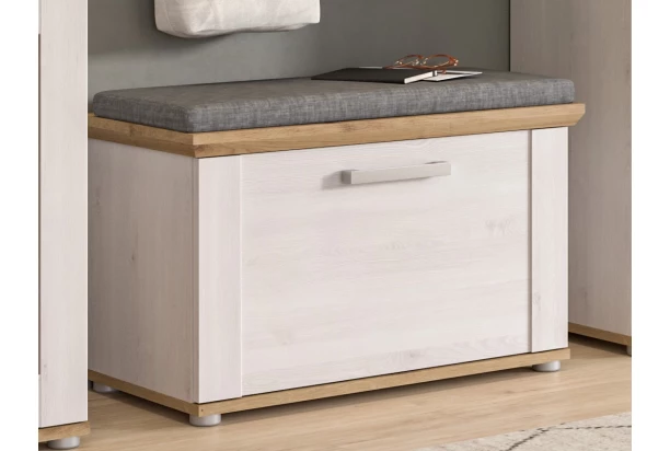 Predsieňová lavica na topánky z programu Verona – elegantný nábytok v kombinácii bieleného sibírskeho smrekovca a duba artisan má okrasné reliéfy a v každom interiéri vytvorí príjemnú domácku atmosféru s rustikálnym nádychom. Táto malá skrinka so šírkou 80 cm má 1 výklopné dvere, za ktorými nájdete police s úložnými priehradkami na topánky, prípadne šatníkové doplnky. Ľahko udržiavateľné povrchy je možné čistiť ľahko navlhčenou handričkou na odstránenie prachu a nečistôt. Táto úložná lavica prakticky poslúži nielen v predsieni, ale napríklad aj v šatni alebo komore.