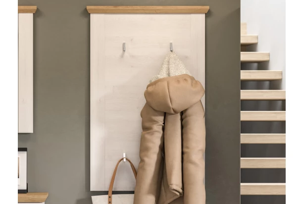Nástenný šatníkový panel z programu Verona – elegantný nábytok v kombinácii bieleného sibírskeho smrekovca a duba Artisan má okrasné reliéfy a v každom interiéri vytvorí príjemnú domácku atmosféru s rustikálnym nádychom. Panel o celkovej šírke 68 cm má závesné háčiky, na ktoré zavesíte bundy, kabáty, tašky, kabelky alebo napríklad čiapky. Ľahko udržiavateľné povrchy je možné čistiť ľahko navlhčenou handričkou na odstránenie prachu a nečistôt. Tento šatníkový panel poslúži nielen v predsieni, ale aj v chodbe alebo šatni.