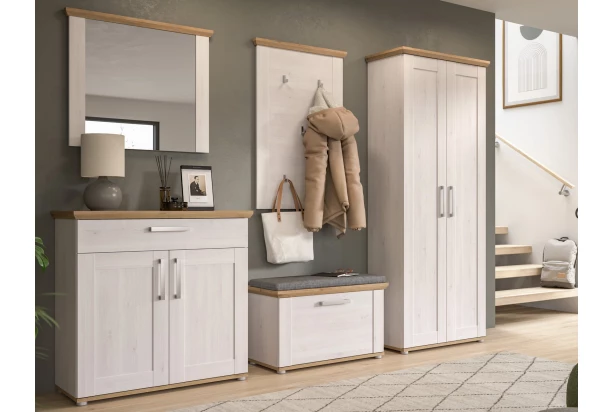 Predsieňová súprava z kolekcie Verona (5-dielna) – elegantný nábytok v kombinácii bieleného sibírskeho smrekovca a remeselného dubu má dekoratívne reliéfy a vytvára príjemnú domácku atmosféru s rustikálnym nádychom v každom interiéri. Táto stena chodby sa skladá celkovo z 5 častí: šatníkovej skrine, lavice do chodby, nástenného šatníka, nástenného zrkadla a skrinky s policami, ktorú môžete použiť aj ako stojan na topánky. Ľahko čistiteľné povrchy je možné čistiť mierne navlhčenou handričkou, aby ste odstránili prach a nečistoty. Jednotlivé časti predsieňového setu môžete ľubovoľne kombinovať alebo si ich usporiadať samostatne podľa svojich potrieb.