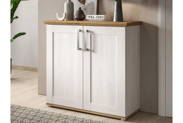 Skrinka z programu Verona – elegantný nábytok v kombinácii bieleného sibírskeho smrekovca a duba artisan má okrasné reliéfy a v každom interiéri vytvorí príjemnú domácku atmosféru s rustikálnym nádychom. Komoda so šírkou 95 cm má 2 dvere, za ktorými nájdete police na ukladanie najrôznejších predmetov alebo oblečenia. Ľahko udržiavateľné povrchy je možné čistiť ľahko navlhčenou handričkou na odstránenie prachu a nečistôt. Táto skrinka prakticky poslúži v obývačke, jedálni, spálni, predsieni alebo kdekoľvek inde, kde potrebujete ukladať veci.