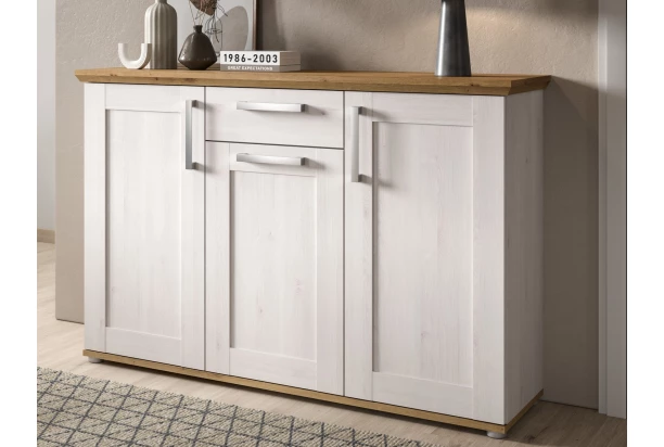 Širšia komoda so zásuvkou z programu Verona – elegantný nábytok v kombinácii bieleného sibírskeho smrekovca a duba artisan má okrasné reliéfy a v každom interiéri vytvorí príjemnú domácku atmosféru s rustikálnym nádychom. Komoda so šírkou 137 cm má 1 zásuvku a 3 dvere, za ktorými nájdete police na ukladanie najrôznejších predmetov alebo oblečenia. Ľahko udržiavateľné povrchy je možné čistiť ľahko navlhčenou handričkou na odstránenie prachu a nečistôt. Táto skrinka prakticky poslúži v obývačke, jedálni, spálni, predsieni alebo kdekoľvek inde, kde potrebujete ukladať veci.
