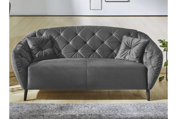 Nadčasová pohovka v glamour štýle zaujme svojim elegantným vzhľadom a poteší pohodlným sedením. Pohovka je očalúnená zamatovo hebkou látkou vo farbe šedá. Prepracované čalúnenie s ozdobnými priehlbinami a prešívanými švami vytvára luxusné akcenty v každom obytnom priestore. Táto zaoblená pohovka s doplnkovými vankúšikmi má stabilné nohy z čierneho kovu, vďaka ktorým je údržba podlahy jednoduchšia.