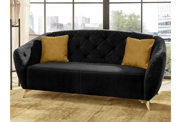 Luxusná pohovka s prešitím zaujme svojim elegantným vzhľadom a poteší komfortom sedenia. Očalúnená zamatovo hebkou látkou vo farbe čierna a doplnená žltými vankúšikmi. Prepracované čalúnenie s kontrastným prešitím vytvára zaujímavé akcenty. Vlnovcové pružiny zaisťujú pohodlné sedenie. Kovové nohy v masazne zlatom prevedení poskytujú stabilitu a zaujmú na pohľad.