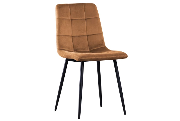 Moderná jedálenská stolička na čiernych kovových nohách je očalúnená hebkou látkou v zamatovej optike vo farbe hnedá camel. Poťah dopĺňa okrasné prešitie.