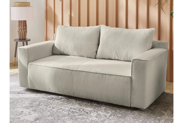 Malá útulná rozkladacia pohovka s opornými vankúšmi je očalúnená mäkkou štruktúrovanou látkou v odtieni šedo-béžová a nájde svoje miesto aj vo veľmi malom priestore. Túto pohovku behom chvíľky premeníte na lôžko na príležitostné spanie alebo relaxáciu ľahkým vysunutím lôžka do bočnej strany. Oceníte aj praktické látkové vrecko na bočnej podrúčke, kam uschováte časopisy alebo napríklad diaľkový ovládač.