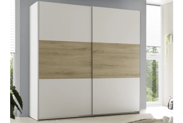 Šatníková skriňa z programu Kiara – tento praktický nábytok v kombinácii biela/dub baysen sa hodí do akejkoľvek moderne zariadenej spálne, šatne alebo chodby. Táto skriňa s celkovou šírkou 215 cm má dvoje posuvné dvere, za ktorými nájdete úložné priestory s kovovou šatníkovou tyčou a policou.
