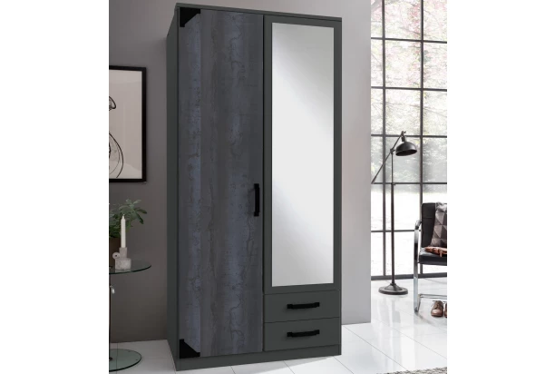 Šatníková skriňa so šírkou 90 cm má zaujímavý industriálny dizajn a skvelo sa hodí do štýlovo zariadenej spálne, šatne či predsiene. Tmavé grafitové plochy dopĺňa imitácia šedej vintage ocele a čiernych kovových prvkov, ktoré zaujmú na pohľad. Táto skriňa obsahuje 2 otočné dvere, praktické zrkadlo a zásuvky.