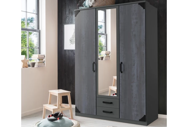 Šatníková skriňa so šírkou 135 cm má zaujímavý industriálny dizajn a skvele sa hodí do štýlovo zariadenej spálne, šatne či predsiene. Tmavé grafitové plochy dopĺňa imitácia šedej vintage ocele a čiernych kovových prvkov, ktoré zaujmú na pohľad. Táto skriňa obsahuje 3 otočné dvere, praktické zrkadlo a zásuvky.