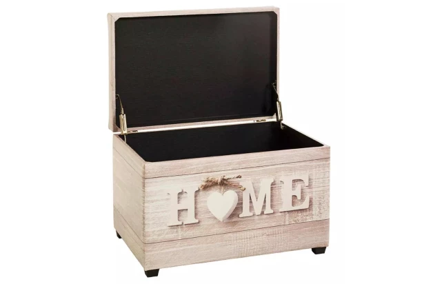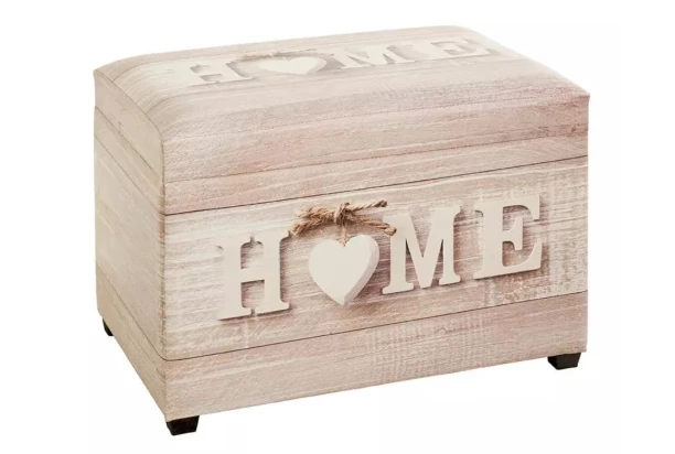 Praktická úložná truhla s výklopným sedákom ukrýva vnútorný priestor na ukladanie najrôznejších predmetov. Potiahnutá ekokožou s motívom dreva a nápisom Home. Túto truhlu na sedenie s úložným priestorom využijete nielen v obývačke a spálni, ale aj napríklad v predsieni ako taburet pri obúvaní.