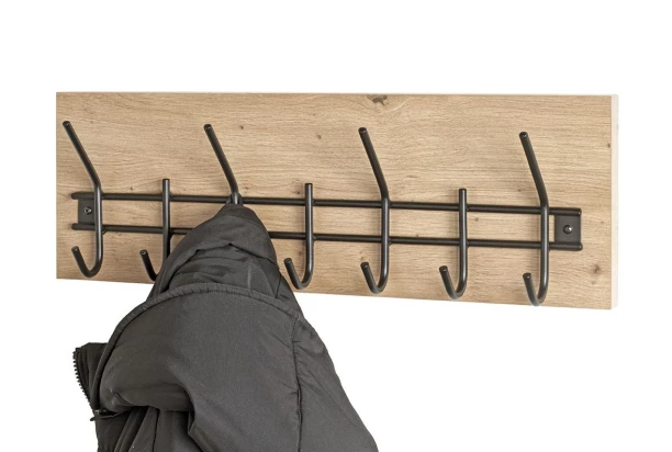 Vešiak na stenu o šírke 60 cm v kombinácii drevodekoru dub artisan a čierneho kovu sa hodí do priestoru akejkoľvek predsiene, spálne alebo šatne. Tento nástenný vešiak obsahuje celkom 11 hákov na zavesenie oblečenia, doplnkov alebo tašiek.