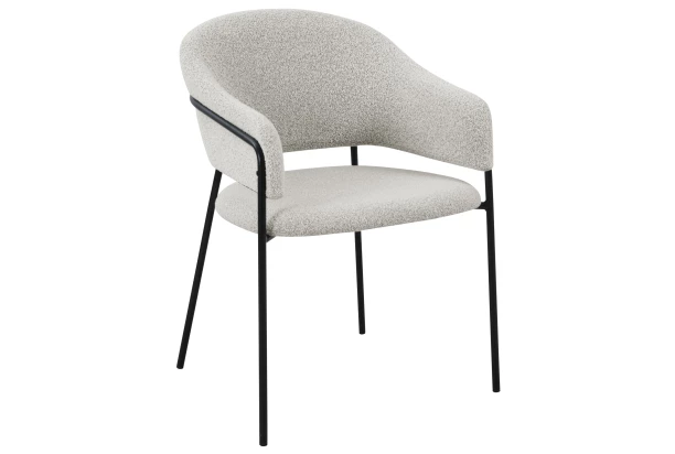 Elegantná jedálenská stolička na čiernej kovovej podnoži má pohodlne zaoblené tvary. Očalúnená štýlovou štruktúrovanou látkou buklé vo farbe svetlá šedo-béžová.