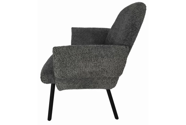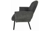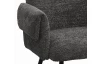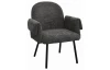 Komfortná jedálenská stolička s opierkami rúk má tvar moderného kresielka a je očalúnená mäkkučkou štruktúrovanou látkou vo farbe tmavo šedá.