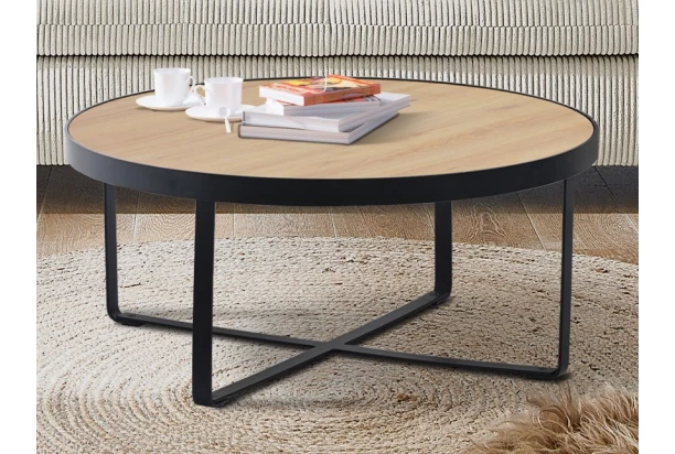 Okrúhly konferenčný stolík má priemer 80 cm a stabilný rám s podnožou z čierno lakovaného kovu. Horná plocha stolíka je vyrobená vo svetlom dubovom drevodekore, ktorý má útulné hrejivé tóny.