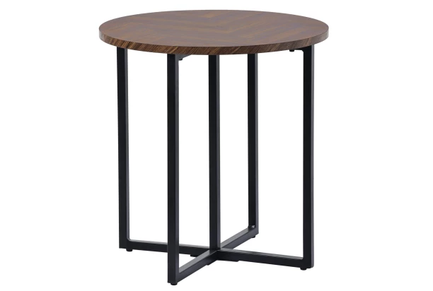 Štýlový odkladací stolík s parketovým vzorom dreva zaujme v interiéri a poslúži na všestranné odkladanie vecí alebo na umiestnenie lampičky, vázy s kvetinou alebo napríklad dekoráciou. Guľatá odkladacia plocha s priemerom 52 cm je umiestnená na čiernej kovovej podnoži, ktorá dáva stolíku veľmi dobrú pevnosť a stabilitu.