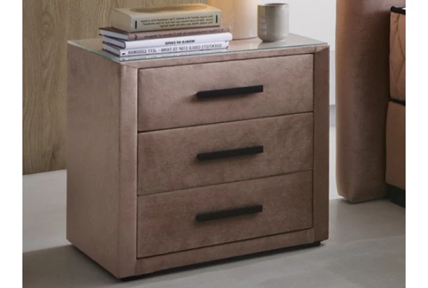 Vysoký nočný stolík s 3 zásuvkami pôsobí v priestore spálne pôsobí veľmi luxusne. Stolík je očalúnený odolnou látkou v optike lesklého zamatu v odtieni tmavo ružová. Horná plocha je pokrytá čírym bezpečnostným sklom, ktoré chráni horný povrch stolíka a umožňuje ľahkú údržbu. Tento nočný stolík sa dokonale hodí na umiestnenie k posteli s vyššou polohou lôžka.