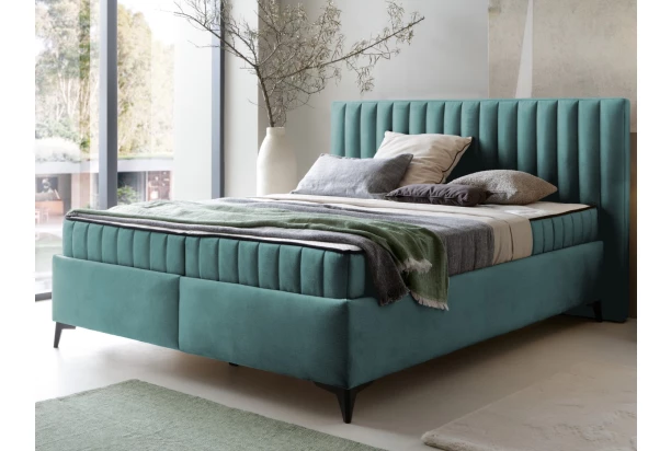 Trendy manželská posteľ s rozmermi lôžka 160×200 cm má štýlové vertikálne prešívanie poťahu a dokonale sa hodí do modernej spálne. Posteľ je čalúnená zamatovo jemnou aqua modrou látkou, ktorá je zároveň veľmi odolná. Súčasťou tejto manželskej postele je vysokokvalitný matrac s taštičkovým jadrom a studenou penou, ktorý zaručuje optimálne pohodlie počas spánku. Vyššia poloha postele uľahčuje vstávanie z postele. V spodnej časti postele nájdete praktické úložné priestory, ktoré sú ľahko prístupné zo strán. Do úložných priestorov môžete uložiť veci, ako sú posteľná bielizeň, prikrývky alebo niektoré sezónne predmety. Posteľ je na nožičkách, takže počas upratovania môžete používať aj robotický vysávač, čo je veľmi praktické.