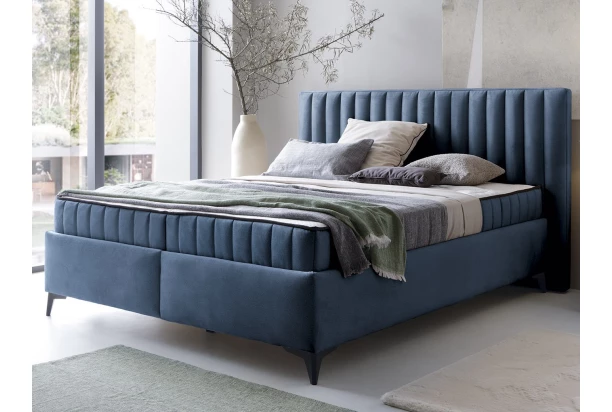 Trendy manželská posteľ o veľkosti lôžka 180×200 cm má štýlové prešitie poťahu vo vertikálnom smere a skvele sa hodí do modernej spálne. Posteľ je očalúnená zamatovo hebkou látkou v odtieni námornícka modrá, ktorá je zároveň aj veľmi odolná. Toto dvojlôžko obsahuje kvalitný vysoký matrac s taštičkovým jadrom a studenou penou, ktoré zaistia optimálny komfort počas spania. Vďaka vyššej polohe lôžka sa vám bude z postele lepšie vstávať. V spodnej časti postele nájdete praktické úložné priestory, ku ktorým sa ľahko dostanete z bočných strán. Do úložných priestorov môžete ukladať napríklad lôžkoviny, deky alebo niektoré sezónne veci. Posteľ je na nôžkach, teda môžete využívať počas upratovania aj robotický vysávač, čo je veľmi praktické.