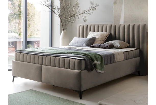 Trendy manželská posteľ o veľkosti lôžka 160×200 cm má štýlové prešitie poťahu vo vertikálnom smere a skvele sa hodí do modernej spálne. Posteľ je očalúnená zamatovo hebkou látkou v odtieni béžová, ktorá je zároveň aj veľmi odolná spanie. Vďaka vyššej polohe lôžka sa vám bude z postele lepšie vstávať. V spodnej časti postele nájdete praktické úložné priestory, ku ktorým sa ľahko dostanete z bočných strán.