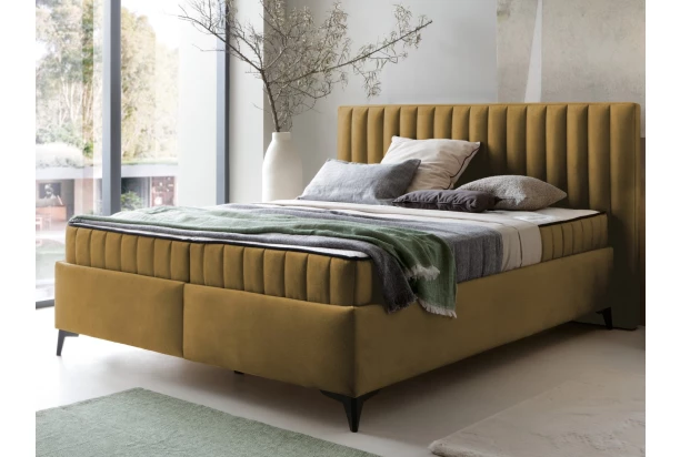 Trendy manželská posteľ o veľkosti lôžka 160×200 cm má štýlové prešitie poťahu vo vertikálnom smere a skvele sa hodí do modernej spálne. Posteľ je očalúnená zamatovo hebkou látkou v odtieni horčicovo žltá, ktorá je zároveň aj veľmi odolná. Toto dvojlôžko obsahuje kvalitný vysoký matrac s taštičkovým jadrom a studenou penou, ktoré zaistia optimálny komfort počas spania. Vďaka vyššej polohe lôžka sa vám bude z postele lepšie vstávať. V spodnej časti postele nájdete praktické úložné priestory, ku ktorým sa ľahko dostanete z bočných strán. Do úložných priestorov môžete ukladať napríklad lôžkoviny, deky alebo niektoré sezónne veci. Posteľ je na nôžkach, teda môžete využívať počas upratovania aj robotický vysávač, čo je veľmi praktické.
