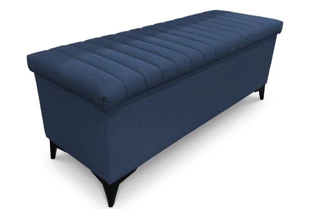 Trendy úložná lavica/periňák sa skvele hodí nielen do modernej spálne, ale aj do obývačky alebo predsiene. Lavica je očalúnená zamatovo hebkou látkou v odtieni námornícka modrá, ktorá je zároveň aj veľmi odolná. Konštrukcia na čiernych nôžkach umožňuje ľahšiu údržbu podlahy. Pod výklopným sedákom nájdete dostatok priestoru na uloženie lôžkovín, príkrývok alebo vecí sezónnej potreby.