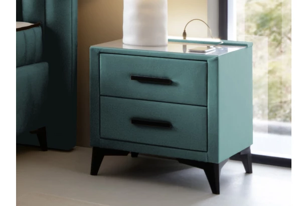 Trendy nočný stolík s 2 zásuvkami sa skvele hodí do modernej spálne. Stolík je očalúnený zamatovo hebkou látkou v odtieni modrozelená aqua, ktorá je zároveň aj veľmi odolná. Zvýšená konštrukcia stolíka na čiernych nôžkach je ideálna pre umiestnenie k vyššiemu lôžku, zároveň umožňuje ľahšiu udržbu podlahy. Horná plocha nočného stolíka je navyše ošetrená čírym bezpečnostným sklom, ktoré prakticky chráni jeho povrch.