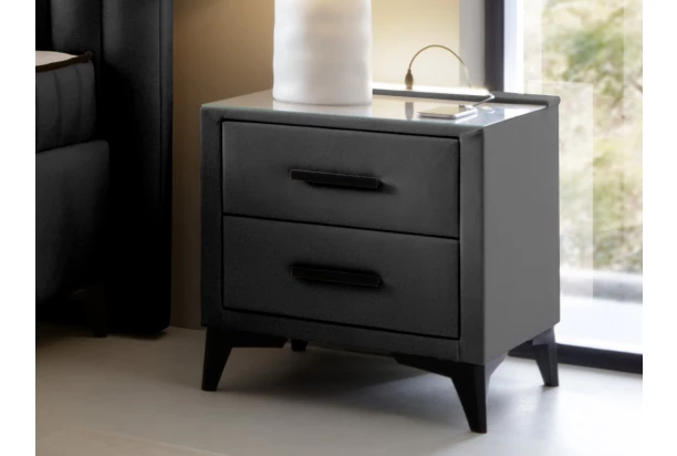 Trendy nočný stolík s 2 zásuvkami sa skvele hodí do modernej spálne. Stolík je očalúnený zamatovo hebkou látkou v odtieni tmavá grafitovo šedá, ktorá je zároveň aj veľmi odolná. Zvýšená konštrukcia stolíka na čiernych nôžkach je ideálna pre umiestnenie k vyššiemu lôžku, zároveň umožňuje ľahšiu udržbu podlahy. Horná plocha nočného stolíka je navyše ošetrená čírym bezpečnostným sklom, ktoré prakticky chráni jeho povrch.