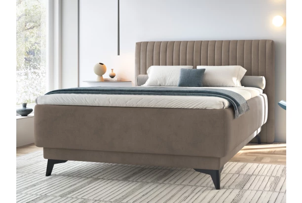 Trendy posteľ s veľkosťou lôžka 140×200 cm má zvislé prešitie zadného čela a je očalúnená zamatovo hebkou látkou vo farbe svetlo hnedá taupe. Posteľ je vybavená komfortným taštičkovým matracom, ktorý rozloží váhu vášho tela a poskytne príjemné pohodlie. Pod lôžkom nájdete praktický úložný priestor, ktorý je prístupný z prednej strany postele.