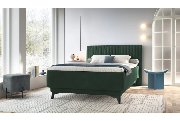 Trendy posteľ s veľkosťou lôžka 140×200 cm má zvislé prešitie zadného čela a je očalúnená zamatovo hebkou látkou vo farbe fľaškovo zelená. Posteľ je vybavená komfortným taštičkovým matracom, ktorý rozloží váhu vášho tela a poskytne príjemné pohodlie. Pod lôžkom nájdete praktický úložný priestor, ktorý je prístupný z prednej strany postele.