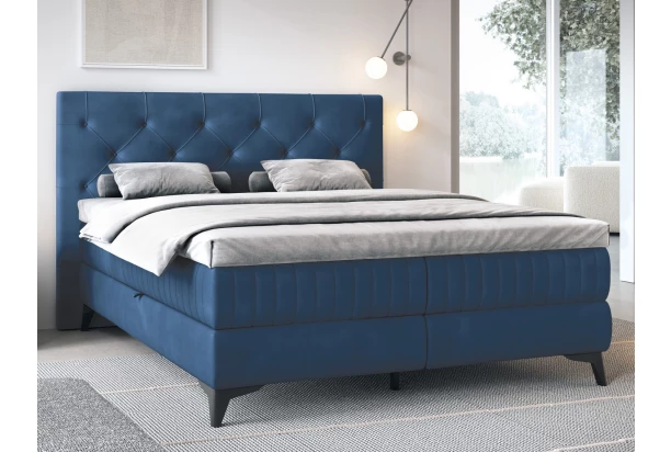 Manželská posteľ o veľkosti lôžka 180×200 cm má vysoké prešívané čelo doplnené gombíkmi a posteľ tak pôsobí luxusným dojmom. Táto dvojlôžková posteľ je očalúnená zamatovo hebkou látkou v odtieni námornícka modrá, ktorá má zaujímavý lesklý efekt a zároveň je aj veľmi odolná. Dvojlôžko obsahuje matrac s taštičkovým jadrom a studenou penou, ktoré poskytujú príjemný komfort počas spánku – príjemne mäkký spánok dopĺňa navyše horný topper zo studenej peny. V dolnej časti postele nájdete úložné priestory, ktoré sú prístupné z bočnej strany.