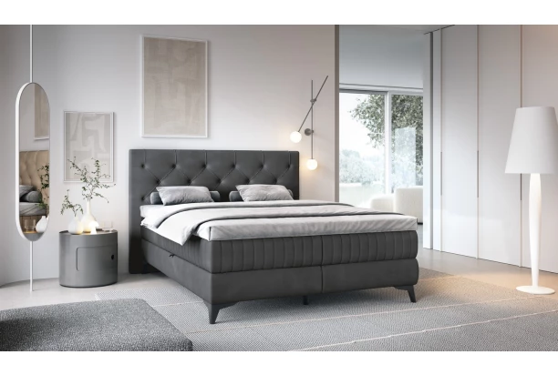 Manželská posteľ o veľkosti lôžka 180×200 cm má vysoké prešívané čelo doplnené gombíkmi a posteľ tak pôsobí luxusným dojmom. Táto dvojlôžková posteľ je očalúnená zamatovo hebkou látkou v odtieni stredne šedá, ktorá má zaujímavý lesklý efekt a zároveň je aj veľmi odolná. Dvojlôžko obsahuje matrac s taštičkovým jadrom a studenou penou, ktoré poskytujú príjemný komfort počas spánku – príjemne mäkký spánok dopĺňa navyše horný topper zo studenej peny. V dolnej časti postele nájdete úložné priestory, ktoré sú prístupné z bočnej strany.