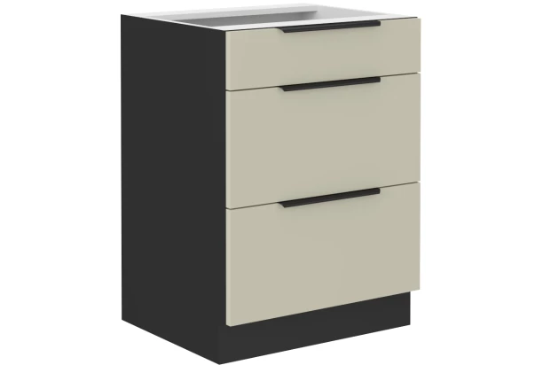 Dolná zásuvková kuchynská skrinka so šírkou 60 cm z programu Arona v jednoduchom, funkčnom a zároveň modernom štýle. V kombinácii kašmírovej a čiernej matnej farby. Jednotlivé elementy z kuchynského programu Arona môžete medzi sebou rôzne kombinovať a zostaviť si tak kuchyňu podľa vašich predstáv a priestorových možností.