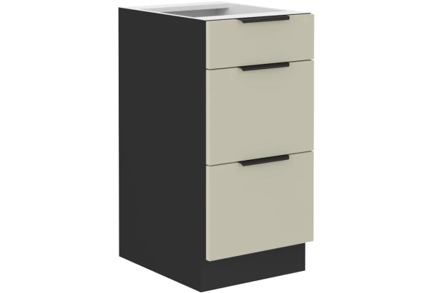 Dolná zásuvková kuchynská skrinka so šírkou 40 cm z programu Arona v jednoduchom, funkčnom a zároveň modernom štýle. V kombinácii kašmírovej a čiernej matnej farby. Jednotlivé elementy z kuchynského programu Arona môžete medzi sebou rôzne kombinovať a zostaviť si tak kuchyňu podľa vašich predstáv a priestorových možností.