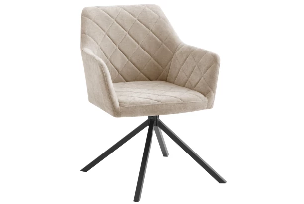 Otočná jedálenská stolička na čiernej kovovej podnoži má pohodlne tvarovaný sedák a pôsobí luxusne. Očalúnená mäkkučkou látkou so zamatovým efektom vo farbe béžová a doplnená výrazným prešivom.
