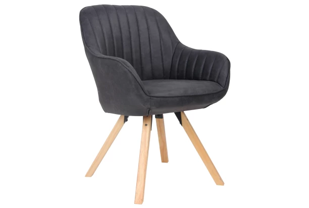 Pohodlná jedálenská stolička v tvare zaobleného kresielka je očalúnená štýlovou látkou vo vintage optike brúsenej kože vo farbe antracitová tmavo šedá. Stabilná podnož stolička je vyrobená z masívneho dreva av priestore jedálne pôsobí útulne.