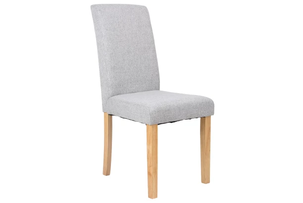 Elegantná jedálenská stolička s vyšším operadlom je očalúnená látkou vo farbe svetlo šedá a doplnená okrasným prešitím na zadnej strane operadla. Nohy z masívneho dreva pôsobia útulne v interiéri jedálne.