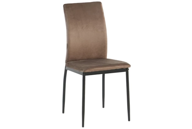 Klasická jedálenská stolička na čiernych kovových nohách je stabilná a sedák má očalúnený zamatovo hebkou látkou vo farbe hnedá.