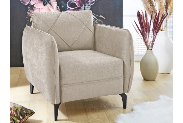 Kreslo s pohodlným vypolstrovaním a oporným vankúšom sa hodí do každej obývačky. Toto kreslo je očalúnené jemne štruktúrovanou žinilkovou látkou vo farbe svetlo béžová a doplnené prešivom. Čierne kovové nôžky pôsobia v interiéri vzdušne a uľahčia vám údržbu podlahy.