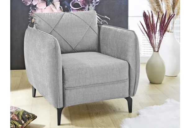 Kreslo s pohodlným vypolstrovaním a oporným vankúšom sa hodí do každej obývačky. Toto kreslo je očalúnené kvalitnou velúrovou látkou vo farbe šedá a doplnené prešivom. Čierne kovové nôžky pôsobia v interiéri vzdušne a uľahčia vám údržbu podlahy.