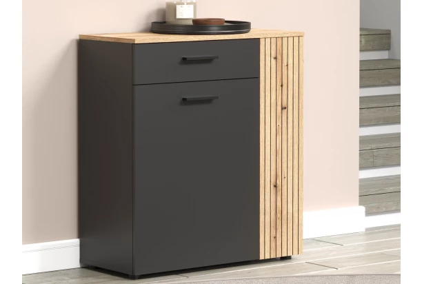 Univerzálna skrinka/botník z programu Esteban – nábytok v kombinácii antracitovo šedých povrchov a dubového drevodekoru je moderný a zároveň pôsobí v interiéri útulne. Predné plochy v rylovanej optike vytvárajú zaujímavý lamelový efekt, ktorý zaujme na pohľad.