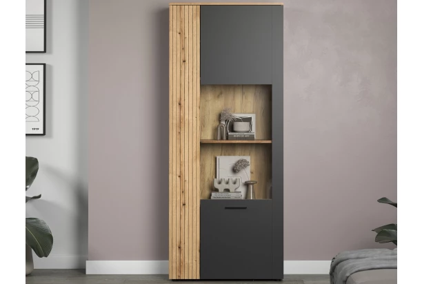 Vysoká vitrína z programu Esteban – nábytok v kombinácii antracitovo šedých povrchov a dubového drevodekoru je moderná a zároveň pôsobí v interiéri útulne. Predné plochy v rylovanej optike vytvárajú zaujímavý lamelový efekt, ktorý zaujme na pohľad.