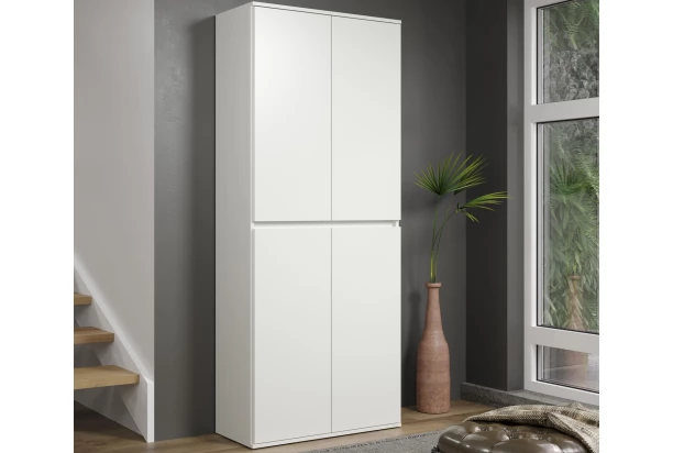Viacúčelová skriňa so šírkou 74 cm v bielej farbe má moderný minimalistický dizajn a pôsobí úplne nadčasovo. Za 4 otočnými dverami nájdete veľmi praktické úložné priestory so šatníkovou tyčou a mnohými policami, ktoré môžete ľubovoľne výškovo nastavovať a prispôsobiť si tak vnútorný priestor podľa potreby. Táto skriňa sa tak univerzálne hodí nielen do predsiene ako predsieňová šatníková skriňa alebo ako veľký botník, ale tiež napríklad do spálne, domácej pracovne, šatne alebo komory, kde vďaka mnohým vnútorným priehradkám veľmi dobre poslúži pre akékoľvek prehľadné ukladanie vecí. Navyše môžete vedľa seba kombinovať aj viac skríň z radu Nevada a Mirror naraz a získať tak naozaj skvelé praktické prostredie pre multifunkčné ukladanie.