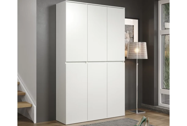 Viacúčelová skriňa so šírkou 111 cm v bielej farbe má moderný minimalistický dizajn a pôsobí úplne nadčasovo. Za 6 otočnými dverami nájdete veľmi praktické úložné priestory so šatníkovou tyčou a mnohými policami, ktoré môžete ľubovoľne výškovo nastavovať a prispôsobiť si tak vnútorný priestor podľa potreby. Táto skriňa sa tak univerzálne hodí nielen do predsiene ako predsieňová šatníková skriňa alebo ako veľký botník, ale tiež napríklad do spálne, domácej pracovne, šatne alebo komory, kde vďaka mnohým vnútorným priehradkám veľmi dobre poslúži pre akékoľvek prehľadné ukladanie vecí. Navyše môžete vedľa seba kombinovať aj viac skríň z radu Nevada a Mirror naraz a získať tak naozaj skvelé praktické prostredie pre multifunkčné ukladanie.