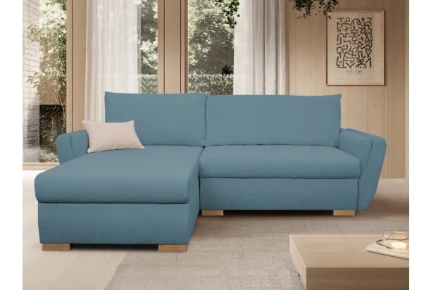 Malá rohová sedacia súprava s pekne zaoblenými podrúčkami pôsobí veľmi elegantne. Sedačka je očalúnená jemne štruktúrovanou látkou vo farbe modrá, ktorá sa vyznačuje zvýšenou odolnosťou. sedákom.