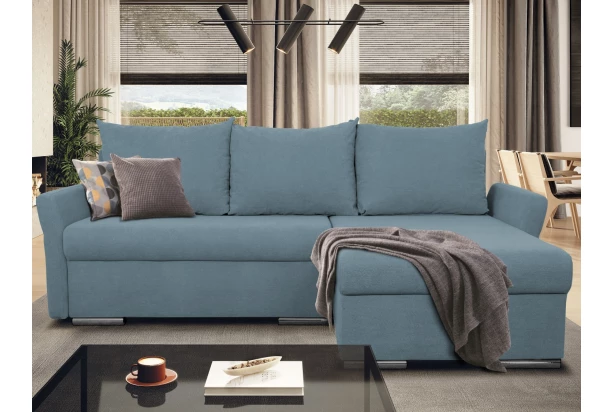 Malá rohová sedačka poskytne príjemné sedenie aj v priestore malej obývačky. Očalúnená jemne štruktúrovanou látkou vo farbe modrá, ktorá sa vyznačuje zvýšenou odolnosťou. Rohová sedacia súprava je možné univerzálne zmontovať ako pravý alebo ľavý roh – bude tak pasovať takmer do akéhokoľvek priestoru. Pod otomanom sedačky nájdete úložný priestor pre univerzálne ukladanie vecí a využijete aj rozkladaciu funkciu na príležitostné spanie alebo pohodovú domácu relaxáciu.