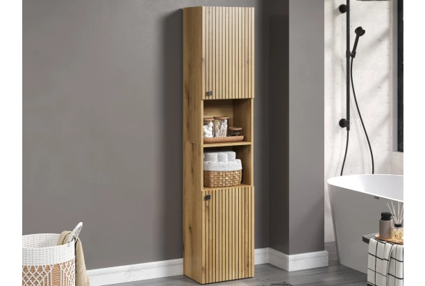 Univerzálna vysoká skrinka s priehradkami nielen do kúpeľne z kolekcie Pure Bliss – moderný nábytok zaujme frézovanými čelnými plochami v lamelovej optike a útulným drevodekorom dub evoke. Za otočnými dvierkami nájdete úložné priestory a výškovo nastaviteľné poličky. Do otvorených priehradok môžete ľahko odkladať napr. uteráky, osušky alebo napríklad kozmetické potreby. Šírka 40 cm.